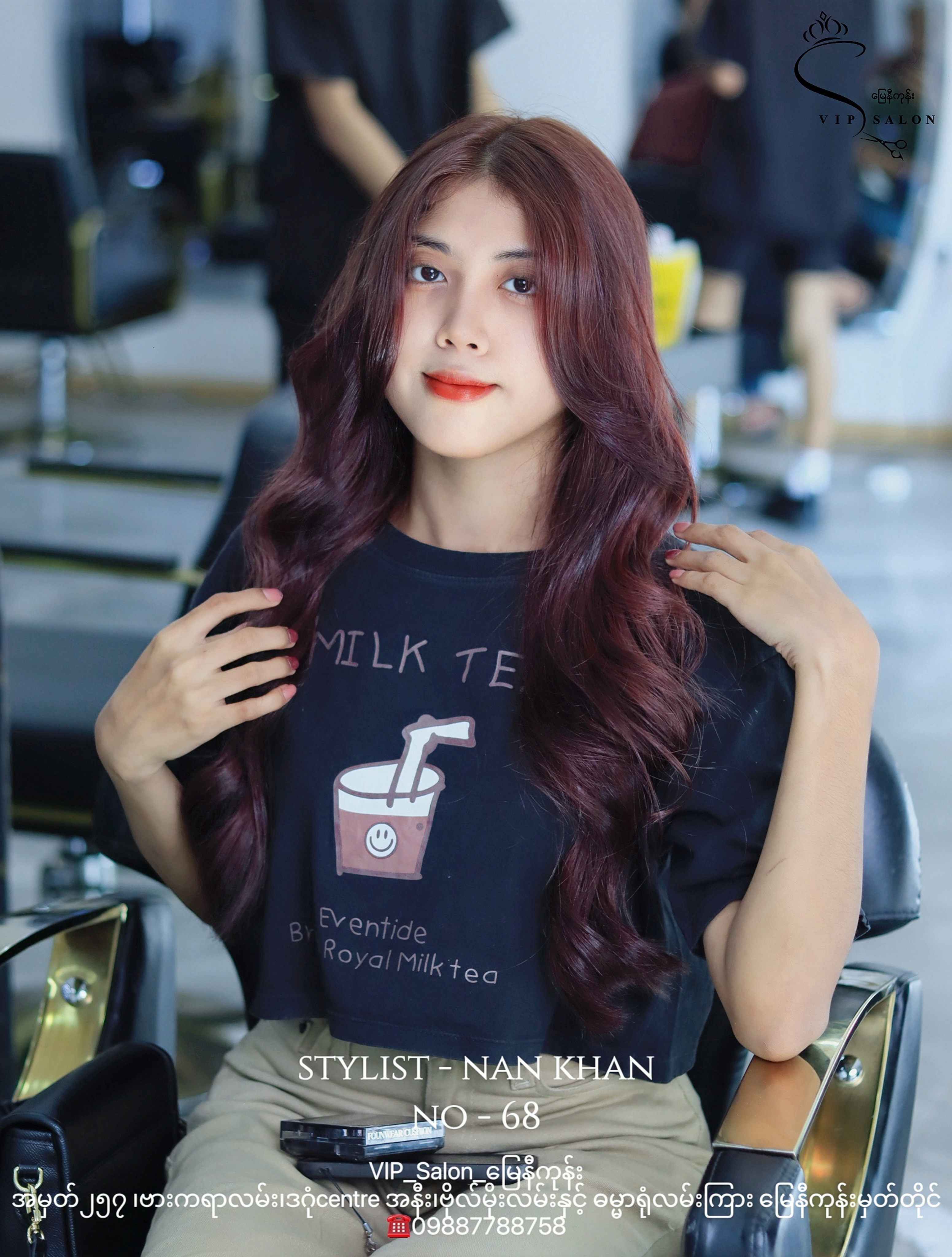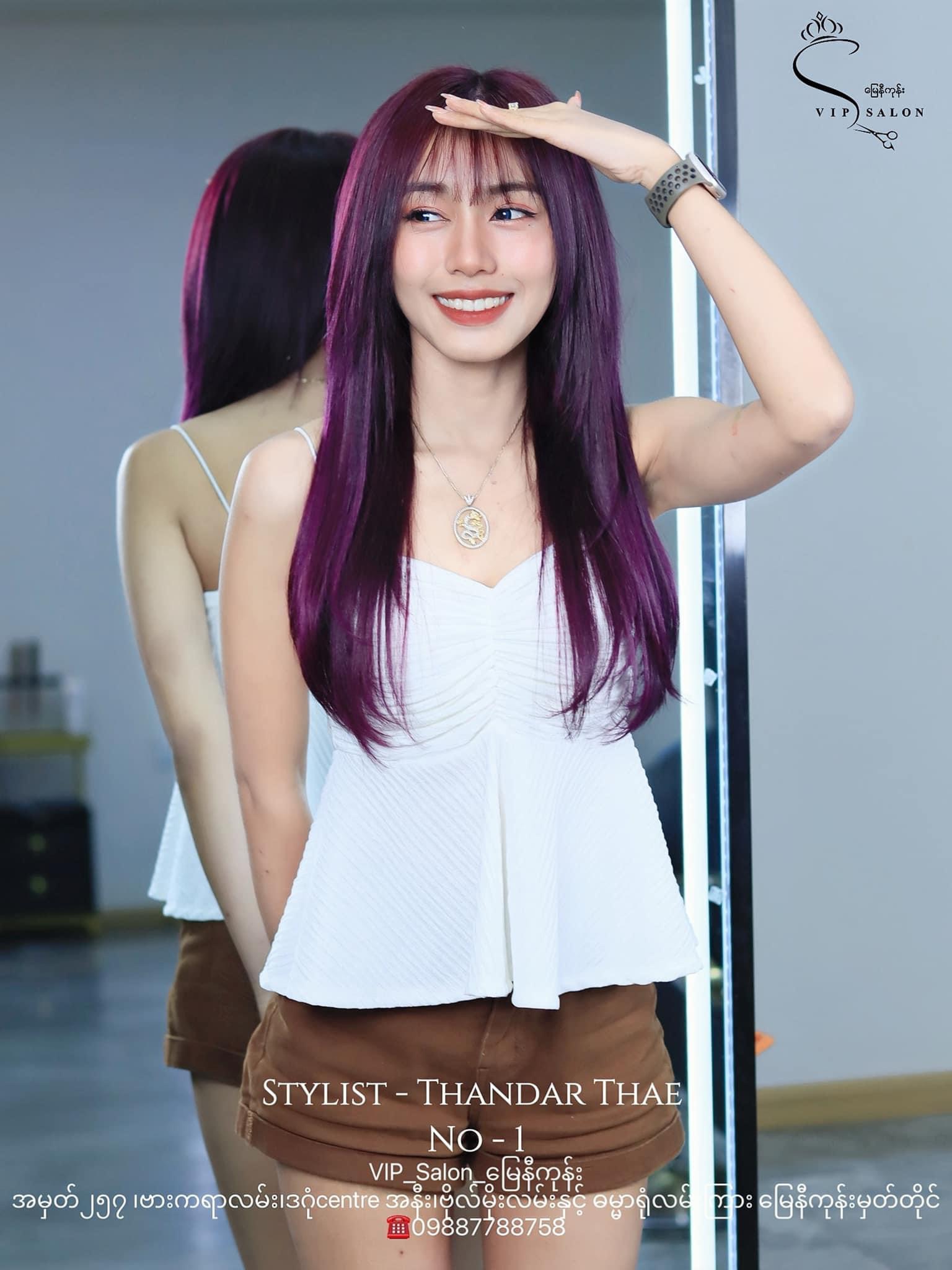 ကျွန်မသည် VIP Hair Salon တွင် 2014ခုနှစ်မှ စပြီး Hair Colour /Hair Permအထူးပြုဖြင့် အလုပ်စတင်ဝင်ရောက်ခဲ့ပါသည်။2018ခုနှစ်တွင်လည်း (တရုတ်ပြည်)သို့သွားရောက်ပီး သင်တန်းများတက်ရှိခဲ့ပါတယ်ရှင်💇🏼💇🏻♀️ 2019ခုနှစ်တွင် VIP Hair Salon Dressing Collage ၌ ကျွန်မ၏အထူးပြုဘာသာရပ်အပြင် အခြားသော ဆံပင်ပိုင်းဆိုင်ရာများကိုလည်း အဆင့်မြင့်မွမ်းမံ သင်ကြားခဲ့ပြီး VIP Hair Salon Dressing College မှ ပေးအပ်သော အသိမှတ်ပြုလက်မှတ်ကိုလည်း ရရှိခဲ့ပါသည်။ ထိုကြောင့် ကျွန်မ၏ Hair Color & Hair Perm အပြင် အခြားဆံပင်ပိုင်းဆိုင်ရာ လုပ်သက်မှာ 2014ခုနှစ်မှ 2024 ခုနှစ်အထိ (11)နှစ် ကြာသက်တမ်းရှိပါပြီ ရှင်။ By Name ဧည့်သည် ဦးရေမှာလည်း (11)နှစ်အတွင်း ၌ လစဥ်တိုင်း ကျွန်မလုပ်ကိုင်ရသော Customer ဦးရေ၏ တစ်ဝက်နီးပါး ရှိပါတယ် ရှင်။ ထို့ကြောင့် ကျွန်မနှင့် Hair Service ယူမည့် ဧည့်သည်တော်များအနေဖြင့် စိတ်တိုင်းကျအလှဆုံး ဖြစ်စေရပါမယ်ရှင်🥰